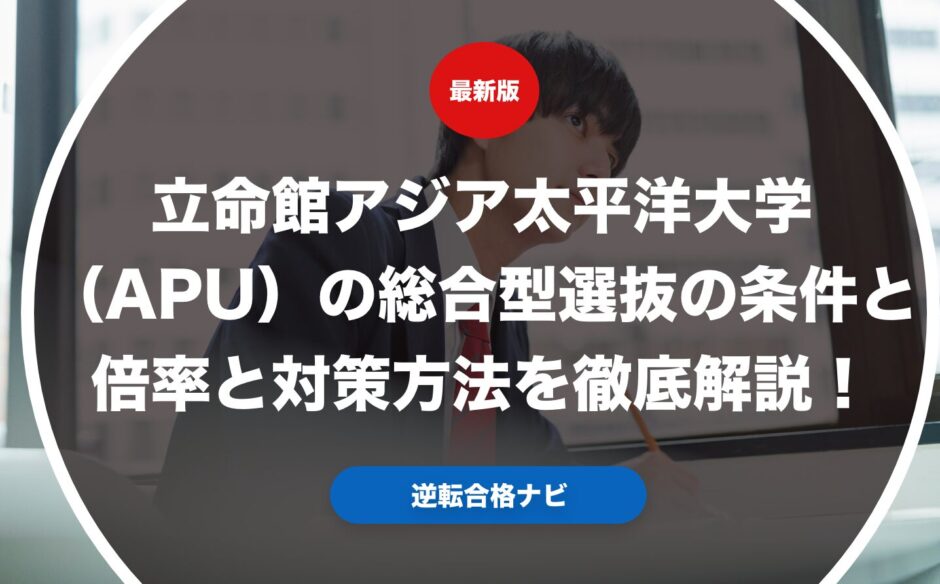 立命館アジア太平洋大学(APU)の総合型選抜に出願および合格するための条件と倍率と対策方法を実際の合格者のデータをもとにして徹底解説します。立命館アジア太平洋大学(APU)に総合型選抜で合格したいという方向けに具体的な条件やおすすめの併願校ややっておくべきた対策を学年別に解説します。立命館アジア太平洋大学(APU)の総合型選抜に合格するコツも分野別に解説。立命館アジア太平洋大学(APU)に合格したいという方はぜひ参考にしてみてください。