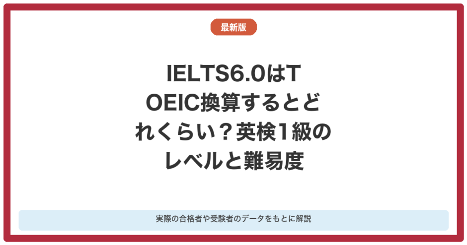 ホームIELTS対策IELTS6.0はTOEIC換算するとどれくらい?比較して解説!2026年3月10日SHAREポストシェアはてブLINEIELTS6.0はTOEICに換算するとスコアは英検何級になるのかを具体的に解説します。またIELTS6.0のスコアが英検5級、英検4級、英検3級、英検準二級、英検2級、英検準一級、英検1級にどれくらいのスコアが該当するのか解説します。さらに実際にIELTS6.0の1次試験、2次試験それぞれリーディング、リスニング、ライティング、面接のレベルもTOEICと比較して解説します。IELTSコーチ 塾長【この記事の監修者:IELTSコーチ塾長竹本明弘】 これまでIELTSで目標スコア達成に向けて小学生から大人まで500名以上の方に対して様々な形で伴走してきました。リスニング、リーディング、ライティング、スピーキングのそれぞれの対策からIELTSでの目標達成に向けて実際にやって良かったことや実際の難易度なども含めてわかりやすく解説します。IELTS6.0はTOEIC換算するとどれくらいのスコアに相当するのか、気になっている方は多いと思います。 この記事ではIELTS6.0とTOEICの関係を詳しく解説しながら、英検との比較や実際の試験内容についてもわかりやすく説明します。IELTS6.0のレベルと難易度IELTS6.0のレベルは、英語の国際基準であるCEFRにおいてB2レベルに相当します。 これは日常的な英語はもちろん、専門的な内容についても概ね理解できる英語力が求められるレベルです。 IELTSは1.0から9.0のバンドスコアで評価される試験で、IELTS6.0は世界的にも大学学部レベルへの入学に必要とされることが多いスコアです。 IELTS6.0のレベルは、英語を概ね効果的に使える有能なレベルと定義されており、不正確さは多少あるものの慣れた場面では複雑な表現も可能な英語力が求められます。 日本人受験者の平均スコアが5.8から5.9程度であることを考えると、IELTS6.0は日本人受験者の平均をやや上回るレベルに位置する目標スコアです。 特にリスニングやスピーキングでは日本人が苦手とする領域が多く含まれるため、しっかりとした対策が必要になります。IELTS6.0はTOEIC換算すると何点?IELTS6.0はTOEICのL&Rスコアに換算すると、およそ740点から900点に相当します。 これはTOEICの中でも中上級者のレベルに位置するスコアであり、ビジネスシーンでも通用する英語力の目安とされています。 ただしTOEICとIELTSでは試験の性質が大きく異なるため、この換算はあくまでも目安として捉えるようにしてください。 TOEICはリスニングとリーディングの2技能のみを測る試験ですが、IELTS6.0はリスニング、リーディング、ライティング、スピーキングの4技能すべてを測定します。 そのためTOEICで高得点を取れていても、IELTS6.0の水準に達しているとは必ずしも言えない点に注意が必要です。 IELTS6.0とTOEICを比較する際には、試験の目的と測定する技能の違いを意識しながら自分の英語力を客観的に判断することが大切です。IELTS6.0のリーディングのレベルと難易度をTOEICと比較IELTS6.0のリーディングでは、学術的な内容の長文3パッセージを60分間で解く必要があります。 各パッセージはおよそ900語程度の長文で、合計40問を解く構成になっています。 TOEICのリーディングと比較すると、IELTS6.0のリーディングは語彙レベルと文章の専門性がかなり高くなっています。 TOEICのリーディングは主にビジネス文書や日常的な通知文が中心ですが、IELTS6.0のリーディングは学術論文や科学的な内容の文章が多く出題されます。 またIELTS6.0のリーディングにはTRUE、FALSE、NOT GIVENという独特の問題形式があり、本文に記載がない選択肢を正確に見極める力が求められます。 1問あたり約1分半のペースで解き進める必要があるため、TOEICに比べてより高い速読力と文脈把握能力が必要です。IELTS6.0のリスニングのレベルと難易度をTOEICと比較IELTS6.0のリスニングは4つのパートで構成されており、合計40問を約30分で解きます。 パート1は日常会話、パート2は日常的な説明、パート3は学術的な会話、パート4は大学の講義形式の音声が流れます。 TOEICのリスニングと比べると、IELTS6.0のリスニングはイギリス英語やオーストラリア英語のアクセントが多く使われる点が大きな違いです。 TOEICではアメリカ英語が中心ですが、IELTS6.0では様々な英語圏のアクセントに対応する必要があります。 またIELTS6.0のリスニングでは音声が1回しか流れないため、聞き逃しが許されない緊張感の中で問題を解く必要があります。 特にパート4の大学講義形式では情報量が多く、TOEICのリスニングと比較してもかなり難易度が高い内容となっています。IELTS6.0とTOEICをCEFRを軸に比較CEFRはヨーロッパ言語共通参照枠と呼ばれる英語力の国際的な基準で、A1からC2までの6段階で英語力を評価します。 IELTS6.0はCEFRにおいてB2レベルに相当するとされており、これは独立した英語使用者の上位レベルを示しています。 TOEICのL&Rスコアで740点から900点がCEFRのB2レベルに相当するとされており、この点においてIELTS6.0とTOEICは同じCEFRの水準に位置してい