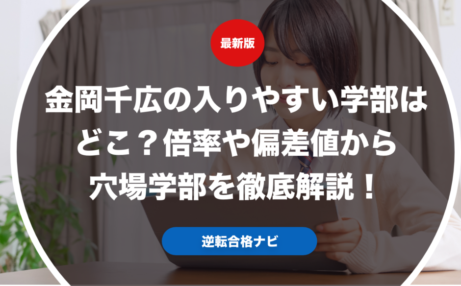 金岡千広の入りやすい学部と穴場学部を具体的に解説します。また金岡千広の倍率の低い穴場学部や偏差値の低い受かりやすい学部学科をそれぞれ解説します。金岡千広志望の受験生やその保護者の方はぜひ参考にしてみてください。