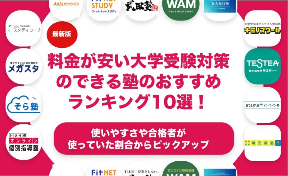 料金が安い大学受験対策ができるオンライン塾をおすすめのランキング形式で10個紹介します。料金が安い大学受験対策ができるオンライン塾を探している方におすすめの選び方や選ぶ上でのポイントも合わせて解説します。料金が安い大学受験対策ができるオンライン塾を料金や特徴で比較しながら解説します。料金が安い大学受験対策ができるオンライン塾の中でも自分に合ったものを見つけたいという方はぜひ参考にしてみてください。