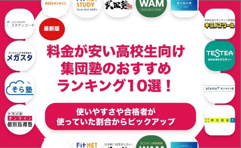 料金が安い高校生向けの集団塾をおすすめのランキング形式で10個紹介します。料金が安い高校生向けの集団塾を探している方におすすめの選び方や選ぶ上でのポイントも合わせて解説します。料金が安い高校生向けの集団塾を料金や特徴で比較しながら解説します。料金が安い高校生向けの集団塾の中でも自分に合ったものを見つけたいという方はぜひ参考にしてみてください。