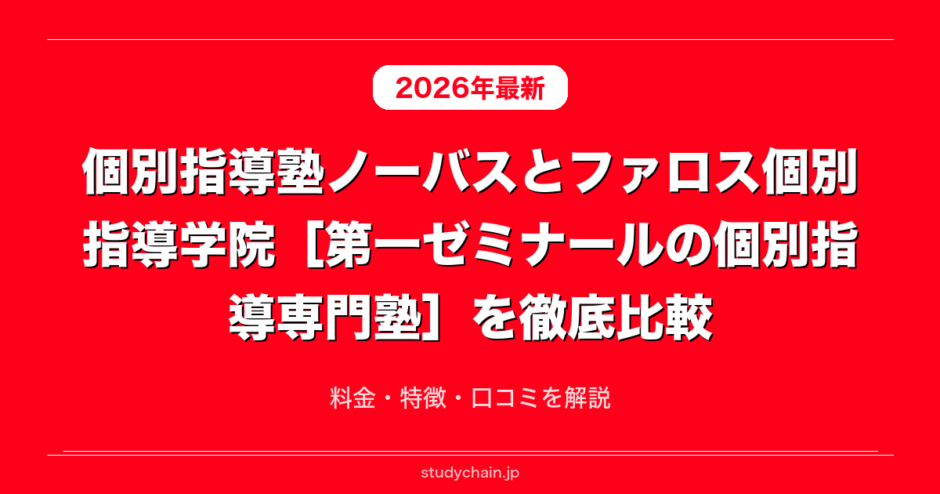 個別指導塾ノーバスとファロス個別指導学院[第一ゼミナールの個別指導専門塾]を料金や口コミや指導体制や指導方針など項目ごとに徹底解説します。個別指導塾ノーバスとファロス個別指導学院[第一ゼミナールの個別指導専門塾]を検討している方に向けてそれぞれどういう方におすすめなのかや個別指導塾ノーバスとファロス個別指導学院[第一ゼミナールの個別指導専門塾]の違いやメリットやデメリットについてもそれぞれ解説します。個別指導塾ノーバスとファロス個別指導学院[第一ゼミナールの個別指導専門塾]の良い口コミと悪い口コミも比較しながら紹介するのでぜひ実際の声も含めて参考にしてみてください。