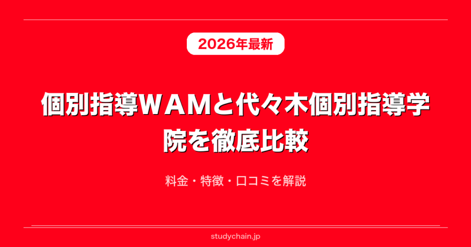個別指導WAMと代々木個別指導学院を料金や口コミや指導体制や指導方針など項目ごとに徹底解説します。個別指導WAMと代々木個別指導学院を検討している方に向けてそれぞれどういう方におすすめなのかや個別指導WAMと代々木個別指導学院の違いやメリットやデメリットについてもそれぞれ解説します。個別指導WAMと代々木個別指導学院の良い口コミと悪い口コミも比較しながら紹介するのでぜひ実際の声も含めて参考にしてみてください。